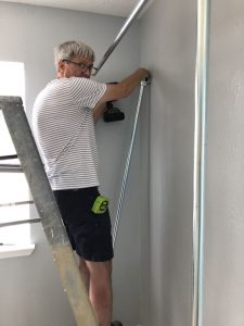 Christian Fuss has spent two afternoons this week, chasing lighting issues and installing more track lighting in the facility. Every room now has light! This is a real treat when the sun goes down and the rooms get a little dark. It will also be great when the merchandise arrives in a few weeks. Of course, we could not have done it without the help of Sonny from SCT Electric. He worked for two to three hours trying to get all of the circuits and daisy chained switches operational. We even have a lot of new GFIC outlets throughout the facility (where they need to be).