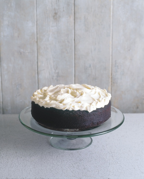 There is enough sugar – a certain understatement here – to counter any potential bitterness of the Guinness, and although I’ve eaten versions of this made up like a chocolate sandwich cake, stuffed and slathered in a rich chocolate icing, I think that can take away from its dark majesty. Besides, I wanted to make a cream cheese frosting to echo the pale head that sits on top of a glass of stout. It’s unconventional to add cream but it makes it frothier and lighter which I regard as aesthetically and gastronomically desirable. But it is perfectly acceptable to leave the cake un-iced: in fact, it tastes gorgeous plain.