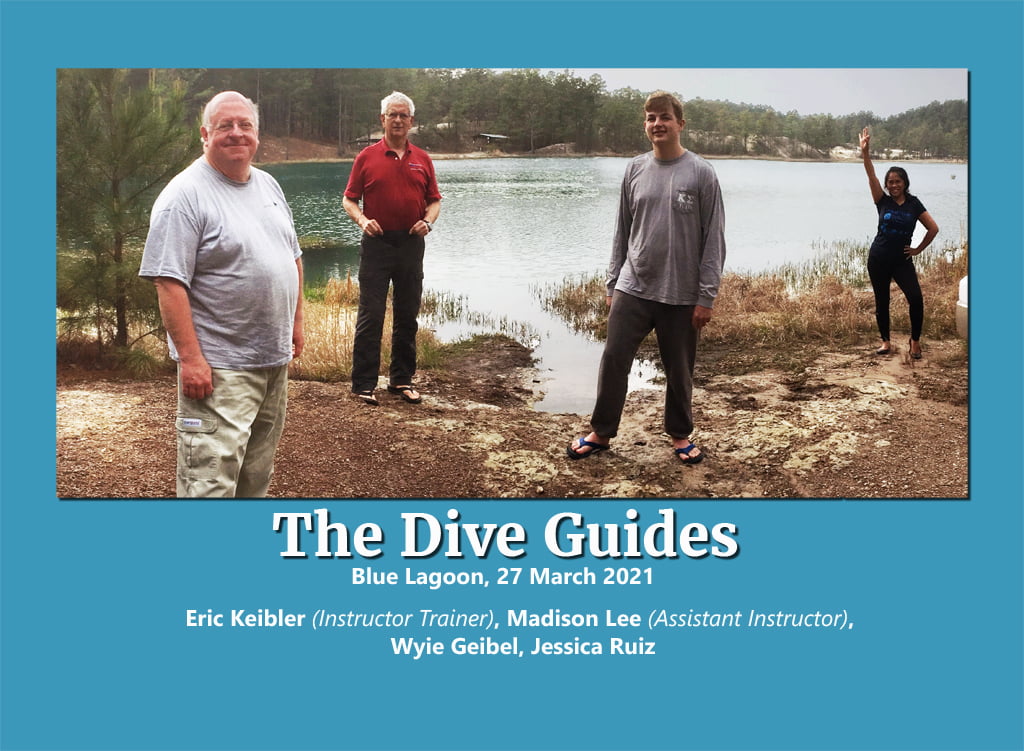 This weekend saw our newest Dive Guide candidates, Wylie and Jessica, brave the cooler waters of Beautiful Blue Lagoon to help Eric and Madison enjoy themselves on their first dives since open water training! At least that was the story we were working under. They were in charge of briefings, tours and logging for the day and making sure theri new divers had a really fun time. Three dives into 61oF water along with some surface antics made for a full-day of training and evaluations.