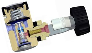 Now that we have an understanding of the physics, it’s time to talk briefly about the types of regulators that go into our air delivery systems. Starting with the first stage, there are two mechanical variants: piston and diaphragm, each of which reacts based on external water pressure. As the names suggest, the piston type has a piston with a rod that opens and closes the main valve on the first stage, while a diaphragm type has a diaphragm that connects to the main valve through a push rod. In either case, when breathing demand causes a pressure drop across the first stage, the main valve opens, keeping the intermediate pressure at the desired value.