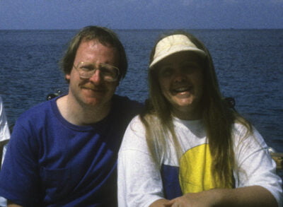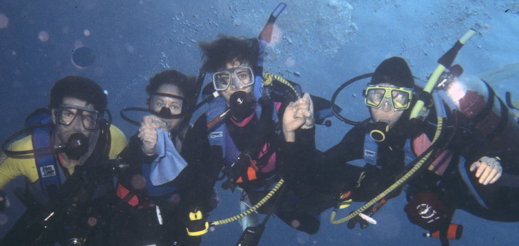 Oceanic Ventures’ First Employee, Mary Ann Henke (now Volmer), center, in the Latest Scuba Equipment 1992