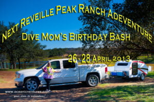 How did we enjoy the weekend? Well, Oceanic Ventures has decided to throw Dive Mom and birthday bash up at Reveille Peak Ranch on 26-28 April 2013 (i.e. this coming April). Everyone is invited to the party and if you are interested in renting a teardrop trailer contact Charlie at hitchandgoadventures.com ahead of time and let him know you what one just like ours (we have already put in a reservation). But don’t worry; Steve Soulen will be coordinating the tent campers and the ever present campfire!