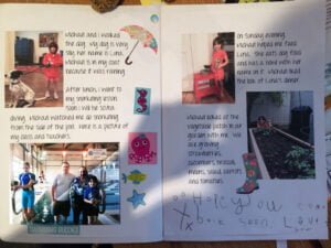 Veerity, one of Dive Mom’s Starfish students brought a friend, Michael Meerkat, to watch her Starfish class this post week. For those of you not familiar with him, he is like Flat Stanley and he gets the opportunity to do lots of things and then the children keep a diary of his adventures. Here is a page from her diary related to this visit.