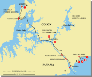 Last week I went through as a line handler on another boat. The locks are very impressive but not nearly as large as I expected. Our raft of two boats tied alongside a tug and shared the three up locks with a huge container. After a long motor across Gatun Lake we rafted back together and locked down the center chamber in front of another container ship. Interestingly, sailboats cross the lake as quickly as large ships. We get to take shortcuts outside the main channel, don’t have to reduce speed when passing dredging operations, and don’t need the assistance of tugs for the tight turns going into the lock area.