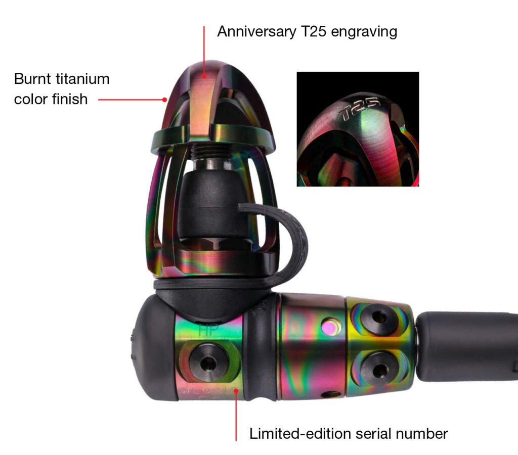 To achieve radical durability, we plated the T25’s machined body with a new, proprietary diamond-like hardness coating (DLC). The result is a “burnt titanium” that’s stunningly beautiful, ultra durable and 100% unique. In fact, with its rainbow-like burnt titanium finish, each T25 is highly exclusive—and no two regulators will share the same appearance.
