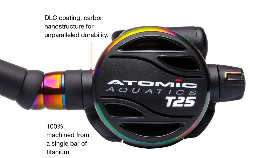 Representing 25 years of breakthroughs and breaking rules, the Atomic Aquatics T25 limited-edition anniversary regulator is a highly evolved version of the iconic T3 all titanium regulator. To achieve the T25’s unparalleled durability and performance, we started with solid bars of titanium alloy and precision machined them to our super-elite specs. But we didn’t stop there.
