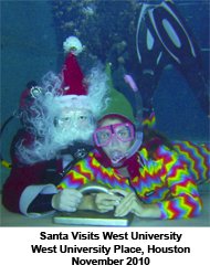 This will be Santa’s fifth visit to the City of West University Place and Houston to pose with adults and children in the swimming pool. The photos are fun and are a great way to start the holiday season. Imagine sending Grandma a photo of the kids underwater with Santa Claus.