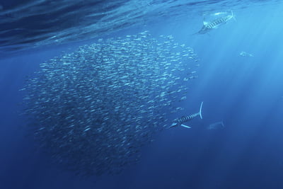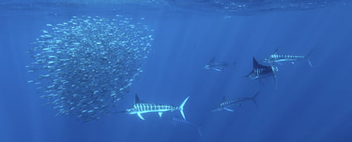 Half a Dozen Marlins Chasing a Bait Ball