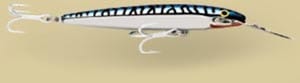 Our meat line deserves a description. This is sixty feet or so of 1/4″ three strand nylon line. A large stainless swivel is tied to the “fishing end”. Ten feet or so of 120 pound stainless wire follows that with a second swivel and snap hook crimped on the end. The leader of a lure is attached to the snap hook and the line is trolled behind the boat. Since the 1/4 line won’t give when a fish strikes we use a four foot piece of heavy bungee as a shock absorber. One end of the bungee is tied to a loop in the 1/4 line and the other end is tied to the aft rail of our boat. Finally, the 1/4 line, with a good bit of slack, is attached to a large cleat on our aft deck. Now when a fish strikes, the bungee will stretch giving the fish a bit of play. Should the bungee break, the 1/4 will take the load. Much like Tom Sawyer tying a fishing line around his toe, we use a clothes pin to hang the slack loop of 1/4 line up in the rigging so we can keep an eye on it from the cockpit. When a fish strikes, the bungee stretches, the loop pulls out of the clothes pin and we eventually notice. It’s a crude but very effective way to fish.